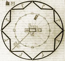 Compared to his predecessor, Ludovico was concerned about reviving the great architectural worksites, partly due to the new awareness of their political significance linked to the fame of the city and, by extension, of its prince.[9] Among the most important works, in which the fruitful exchanges between masters were consummated, were essentially the Pavia Cathedral (of which a wooden model dating from 1497 is still preserved), the castle and square of Vigevano, and the tiburium of the Milan Cathedral.[9] Studies on centrally planned buildings enlivened Bramante's research and fascinated Leonardo, filling pages of his codices with solutions of increasing complexity.[9]