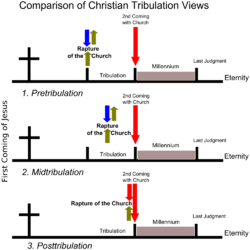 Differing viewpoints exist about the exact timing of the rapture and whether Christ's return would occur in one event or two. Pretribulationism distinguishes the rapture from the second coming of Jesus Christ mentioned in the Gospel of Matthew, 2 Thessalonians, and Revelation. This view holds that the rapture would precede the seven-year Tribulation, which would culminate in Christ's second coming and be followed by a thousand-year Messianic Kingdom.[3][4] This theory grew out of the translations of the Bible that John Nelson Darby analyzed in 1833. Pretribulationism is the most widely held view among Christians believing in the rapture today, although this view is disputed within evangelicalism.[5] Some assert a post-tribulational rapture.