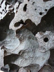 The deep crevasses of the meteorite resulted from both its high-speed atmospheric entry and its subsequent weathering. Exposed to the elements for thousands of years, rainwater interacted with the mineral troilite, resulting in a form of sulfuric acid which slowly dissolved portions of the meteorite. This resulted in the gradual development of the hollows that are visible today.