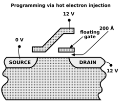 A single-level NOR flash cell in its default state is logically equivalent to a binary "1" value, because current will flow through the channel under application of an appropriate voltage to the control gate, so that the bitline voltage is pulled down. A NOR flash cell can be programmed, or set to a binary "0" value, by the following procedure: