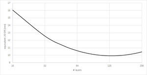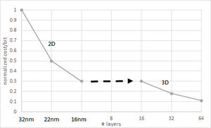 The wafer cost of a 3D NAND is comparable with scaled down (32 nm or less) planar NAND Flash.[78] However, with planar NAND scaling stopping at 16 nm, the cost per bit reduction can continue by 3D NAND starting with 16 layers. However, due to the non-vertical sidewall of the hole etched through the layers; even a slight deviation leads to a minimum bit cost, i.e., minimum equivalent design rule (or maximum density), for a given number of layers; this minimum bit cost layer number decreases for smaller hole diameter.[79]