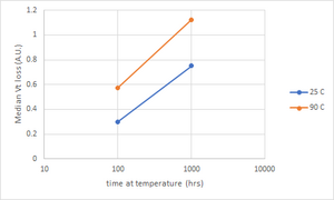 Data stored on flash cells is steadily lost due to electron detrapping[definition needed]. The rate of loss increases exponentially as the absolute temperature increases. For example: For a 45 nm NOR Flash, at 1000 hours, the threshold voltage (Vt) loss at 25 deg Celsius is about half that at 90 deg Celsius.[81]