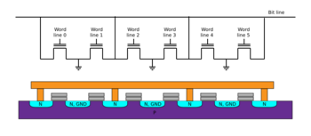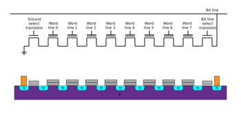 NAND flash also uses floating-gate transistors, but they are connected in a way that resembles a NAND gate: several transistors are connected in series, and the bit line is pulled low only if all the word lines are pulled high (above the transistors' VT). These groups are then connected via some additional transistors to a NOR-style bit line array in the same way that single transistors are linked in NOR flash.