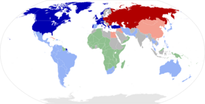 The world lived in the constant fear of World War III in the Cold War. Seemingly any conflict involving Communism might lead to a conflict between the Warsaw pact countries and the NATO countries. The prospect of a third world war was made even more frightening by the fact that it would almost certainly be a nuclear war. In 1949 the Soviets developed their first atomic bomb, and soon both the United States and Soviet Union had enough to destroy the world several times over. With the development of missile technology, the stakes were raised as either country could launch weapons from great distances across the globe to their targets. Eventually, Britain, France, and China would also develop nuclear weapons. It is believed that Israel developed nuclear weapons as well.