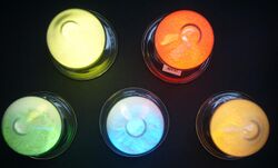 Some rare-earth activated SiAlONs are photoluminescent and can serve as phosphors. Europium(II)-doped β-SiAlON absorbs in ultraviolet and visible light spectrum and emits intense broadband visible emission. Its luminance and color does not change significantly with temperature, due to the temperature-stable crystal structure. It has a great potential as a green down-conversion phosphor for white LEDs; a yellow variant also exists. For white LEDs, a blue LED is used with a yellow phosphor, or with a green and yellow SiAlON phosphor and a red CaAlSiN3-based (CASN) phosphor.[4]