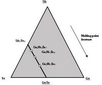 GeSbTe is a ternary compound of germanium, antimony, and tellurium, with composition GeTe-Sb2Te3. In the GeSbTe system, there is a pseudo-line as shown upon which most of the alloys lie. Moving down this pseudo-line, it can be seen that as we go from Sb2Te3 to GeTe, the melting point and glass transition temperature of the materials increase, crystallization speed decreases and data retention increases. Hence, in order to get high data transfer rate, we need to use material with fast crystallization speed such as Sb2Te3. This material is not stable because of its low activation energy. On the other hand, materials with good amorphous stability like GeTe has slow crystallization speed because of its high activation energy. In its stable state, crystalline GeSbTe has two possible configurations: hexagonal and a metastable face-centered cubic (FCC) lattice. When it is rapidly crystallized however, it was found to have a distorted rocksalt structure. GeSbTe has a glass transition temperature of around 100 °C.[7] GeSbTe also has many vacancy defects in the lattice, of 20 to 25% depending on the specific GeSbTe compound. Hence, Te has an extra lone pair of electrons, which are important for many of the characteristics of GeSbTe. Crystal defects are also common in GeSbTe and due to these defects, an Urbach tail in the band structure is formed in these compounds. GeSbTe is generally p type and there are many electronic states in the band gap accounting for acceptor and donor like traps. GeSbTe has two stable states, crystalline and amorphous. The phase change mechanism from high resistance amorphous phase to low resistance crystalline phase in nano-timescale and threshold switching are two of the most important characteristic of GeSbTe.