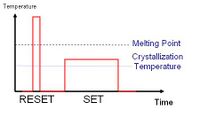 Threshold switching occurs when GeSbTe goes from a high resistive state to a conductive state at the threshold field of about 56 V/um.[8] This can be seen from the current-voltage (IV) plot, where current is very low in the amorphous state at low voltage until threshold voltage is reached. Current increases rapidly after the voltage snapback. The material is now in the amorphous "ON" state, where the material is still amorphous, but in a pseudo-crystalline electric state. In crystalline state, the IV characteristics is ohmic. There had been debate on whether threshold switching was an electrical or thermal process. There were suggestions that the exponential increase in current at threshold voltage must have been due to generation of carriers that vary exponentially with voltage such as impact ionization or tunneling.[9]