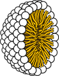When used for cleaning, soap solubilizes particles and grime, which can then be separated from the article being cleaned. The insoluble oil/fat "dirt" become associated inside micelles, tiny spheres formed from soap molecules with polar hydrophilic (water-attracting) groups on the outside and encasing a lipophilic (fat-attracting) pocket, which shields the oil/fat molecules from the water, making them soluble. Anything that is soluble will be washed away with the water. In hand washing, as a surfactant, when lathered with a little water, soap kills microorganisms by disorganizing their membrane lipid bilayer and denaturing their proteins.[5][6][7] It also emulsifies oils, enabling them to be carried away by running water.[8]