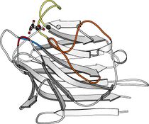 A typical legume lectin monomer (lentil lectin), complexed with a sugar (glucose). The four sugar-binding loops are shown in different colours. The variable loop that confers monosaccharide specificity is shown in orange. |