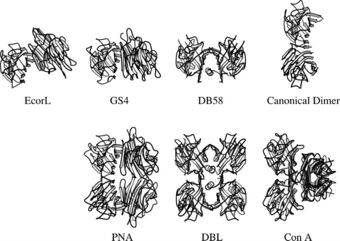 Quaternary structures of some legume lectins. One of the subunits is in the same orientation in all structures for ease of comparison. |