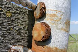 Accelerated low-water corrosion (ALWC) is a particularly aggressive form of MIC that affects steel piles in seawater near the low water tide mark. It is characterized by an orange sludge, which smells of hydrogen sulfide when treated with acid. Corrosion rates can be very high and design corrosion allowances can soon be exceeded leading to premature failure of the steel pile.[6] Piles that have been coated and have cathodic protection installed at the time of construction are not susceptible to ALWC. For unprotected piles, sacrificial anodes can be installed locally to the affected areas to inhibit the corrosion or a complete retrofitted sacrificial anode system can be installed. Affected areas can also be treated using cathodic protection, using either sacrificial anodes or applying current to an inert anode to produce a calcareous deposit, which will help shield the metal from further attack.