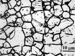 A stainless steel is said to be "sensitized" if chromium carbides are formed in the microstructure. A typical microstructure of a normalized type 304 stainless steel shows no signs of sensitization, while a heavily sensitized steel shows the presence of grain boundary precipitates. The dark lines in the sensitized microstructure are networks of chromium carbides formed along the grain boundaries.
