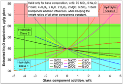The standard procedure ISO 719[20] describes a test of the extraction of water-soluble basic compounds under neutral conditions: 2 g of glass, particle size 300–500 μm, is kept for 60 min in 50 mL de-ionized water of grade 2 at 98 °C; 25 mL of the obtained solution is titrated against 0.01 mol/L HCl solution. The volume of HCl required for neutralization is classified according to the table below.