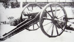 The first cannon to contain all 'modern' features is generally considered to be the French 75 of 1897.[48][49] The gun used cased ammunition, was breech-loading, had modern sights, and a self-contained firing mechanism. It was the first field gun to include a hydro-pneumatic recoil mechanism, which kept the gun's trail and wheels perfectly still during the firing sequence. Since it did not need to be re-aimed after each shot, the crew could fire as soon as the barrel returned to its resting position. In typical use, the French 75 could deliver fifteen rounds per minute on its target, either shrapnel or melinite high-explosive, up to about 5 miles (8,500 m) away. Its firing rate could even reach close to 30 rounds per minute, albeit only for a very short time and with a highly experienced crew. These were rates that contemporary bolt action rifles could not match.