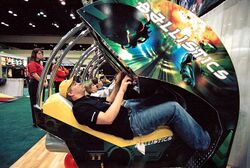 Grin announced in May 2001 that it was working on an arcade version of Ballistics for distribution by Triotech.[9] The game's gameplay had to be reworked to suit an arcade environment, and support was added for multiplayer games with up to eight linked cabinets. Triotech designed a unique reclined seating cabinet for the game, the aim of the design was to offer the player a more comfortable and immersive experience. The inspiration for the design came to Triotech co-founder, Ernest Yale; who whilst putting his feet up on the desk, realised how comfortable the playing position was. Ballistics was released for arcades in January 2002.[10]