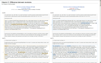 Wikis are generally designed with the philosophy of making it easy to correct mistakes, rather than making it difficult to make them. Thus, while wikis are very open, they provide a means to verify the validity of recent additions to the body of pages. The most prominent, on almost every wiki, is the "Recent Changes" page—a specific list showing recent edits, or a list of edits made within a given time frame.[20] Some wikis can filter the list to remove minor edits and edits made by automatic importing scripts ("bots").[21] From the change log, other functions are accessible in most wikis: the revision history shows previous page versions and the diff feature highlights the changes between two revisions. Using the revision history, an editor can view and restore a previous version of the article. This gives great power to the author to eliminate edits. The diff feature can be used to decide whether or not this is necessary. A regular wiki user can view the diff of an edit listed on the "Recent Changes" page and, if it is an unacceptable edit, consult the history, restoring a previous revision; this process is more or less streamlined, depending on the wiki software used.[22]