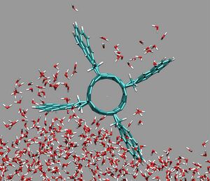 The molecular propellers designed in the group of Prof. Petr Král from the University of Illinois at Chicago have their blades formed by planar aromatic molecules and the shaft is a carbon nanotube.[3] Molecular dynamics simulations show that these propellers can serve as efficient pumps in the bulk and at the surfaces of liquids. Their pumping efficiency depends on the chemistry of the interface between the blades and the liquid. For example, if the blades are hydrophobic, water molecules do not bind to them, and the propellers can pump them well. If the blades are hydrophilic, water molecules form hydrogen bonds with the atoms in the polar blades. This can largely block the flow of other water molecules around the blades and significantly slow down their pumping.