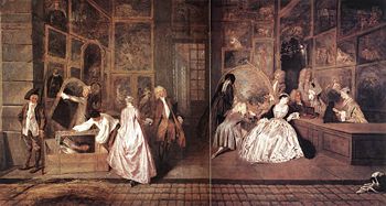 Watteau's final masterpiece, the Shop-sign of Gersaint was effectively the final curtain of Watteau's theater. The apparent theme of the painting appears to be the promotion of art. This famous scene takes place in an art gallery where the façade has magically vanished. Watteau has taken the setting of the gallery and fused it with that of the street to create one contiguous drama.