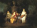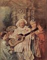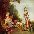 A Lady in a Garden Taking Coffee with Some Children adapts his typical parkland setting in a scene depicting ideal family life in a perfect setting. His most outstanding works include The Embarkation for Cythera (Louvre), Gilles (Louvre), Perspective (Museum of Fine Arts, Boston), Mezzetin (Metropolitan Museum of Art), and Gersaint's Shop Sign (Berlin).