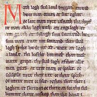 ![]() The first page of the Jutlandic Law originally from 1241 in Codex Holmiensis, copied in 1350. The first sentence is: "Mæth logh skal land byggas" Modern orthography: "Med lov skal land bygges" English translation: "With law shall a country be built" | |