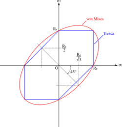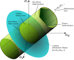 The Huber–von Mises criterion[13] is based on the Tresca criterion but takes into account the assumption that hydrostatic stresses do not contribute to material failure. M. T. Huber was the first who proposed the criterion of shear energy.[14][15] Von Mises solves for an effective stress under uniaxial loading, subtracting out hydrostatic stresses, and states that all effective stresses greater than that which causes material failure in uniaxial loading will result in plastic deformation.
