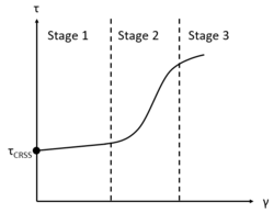 During the easy glide stage 1, the work hardening rate, defined by the change in shear stress with respect to shear strain (dτ/dγ) is low, representative of a small amount of applied shear stress necessary to induce a large amount of shear strain. Facile dislocation glide and corresponding flow is attributed to dislocation migration along parallel slip planes only (i.e. one slip system). Moderate impedance to dislocation migration along parallel slip planes is exhibited according to the weak stress field interactions between these dislocations, which heightens with smaller interplanar spacing. Overall, these migrating dislocations within a single slip system act as weak obstacles to flow, and a modest rise in stress is observed in comparison to the yield stress. During the linear hardening stage 2 of flow, the work hardening rate becomes high as considerable stress is required to overcome the stress field interactions of dislocations migrating on non-parallel slip planes (i.e. multiple slip systems), acting as strong obstacles to flow. Much stress is required to drive continual dislocation migration for small strains. The shear flow stress is directly proportional to the square root of the dislocation density (τflow ~ρ½), irrespective of the evolution of dislocation configurations, displaying the reliance of hardening on the number of dislocations present. Regarding this evolution of dislocation configurations, at small strains the dislocation arrangement is a random 3D array of intersecting lines. Moderate strains correspond to cellular dislocation structures of heterogeneous dislocation distribution with large dislocation density at the cell boundaries, and small dislocation density within the cell interior. At even larger strains the cellular dislocation structure reduces in size until a minimum size is achieved. Finally, the work hardening rate becomes low again in the exhaustion/saturation of hardening stage 3 of plastic flow, as small shear stresses produce large shear strains. Notably, instances when multiple slip systems are oriented favorably with respect to the applied stress, the τCRSS for these systems may be similar and yielding may occur according to dislocation migration along multiple slip systems with non-parallel slip planes, displaying a stage 1 work-hardening rate typically characteristic of stage 2. Lastly, distinction between time-independent plastic deformation in body-centered cubic transition metals and face centered cubic metals is summarized below.