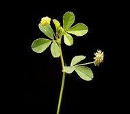 Medicago lupulina is an annual or short-lived perennial plant,[8]:168 growing each year from adventitious buds on the roots. Mature plants measure from 15 to 80 cm (6 to 31 in) in height, with fine stems often lying flat at the beginning of growth and later erecting. The leaves are compound, each with three oval leaflets, carried on a short petiole; the center leaflet usually has a longer petiole.[9][2] The leaflets are hairy, toothed toward the tip, and differ from those of the similar Trifolium dubium in that they end in a short point.[10]:148[8]:175