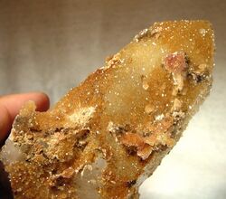 Hubeite is mainly associated to a skarn assemblage with pink inesite, colorless apophyllite, quartz, pyrite and colorless-white calcite (Hawthorne et al., 2004). They all occur together at the Daye Mine. Usually hubeite appears in two different situations. It may occur as isolated aggregates of crystals perched on white quartz, or it may occur covering both sides of thick specimens, that are usually pink inesite and apophyllite (Hawthorne et al., 2002). Figures 3 and 4 illustrate both situations.