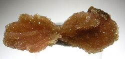 Hubeite is most common as aggregates of intergrown crystals (Fig.1) that are usually less than 5 mm across and that have individual crystals with well-developed faces that are as long as 1 mm (Hawthorne et al., 2002). The color ranges from pale to dark brown, depending on the crystal size (Fig.2). Other properties consist of a pale orange-brown streak, vitreous luster, non-fluorescence, and one good cleavage parallel to the c-axis. It is also brittle with conchoidal fracture, has a hardness of 5.5 in the Mohs scale and a specific gravity of 3.02 (Hawthorn et al., 2002). As for optical features, it is important to note that hubeite is strongly pleochroic, biaxial with an indeterminate optic sign and has a birefringence of 0.023 (γ-α) (Hawthorne et al., 2002).