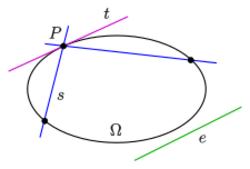 When |l ∩ Ω| = 0 the line l is an exterior line (or passant),[1] if |l ∩ Ω| = 1 a tangent line and if |l ∩ Ω| = 2 the line is a secant line.