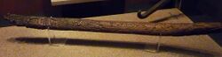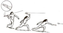 Wooden darts were known at least since the Middle Paleolithic (Schöningen, Torralba, Clacton-on-Sea and Kalambo Falls). While the spear-thrower is capable of casting a dart well over one hundred meters, it is most accurately used at distances of twenty meters or less. The spearthrower is believed to have been in use by Homo sapiens since the Upper Paleolithic (around 30,000 years ago).[12] Most stratified European finds come from the Magdalenian (late upper Palaeolithic). In this period, elaborate pieces, often in the form of animals, are common. The earliest reliable data concerning atlatls have come from several caves in France dating to the Upper Paleolithic, about 21,000 to 17,000 years ago. The earliest known example is a 17,500-year-old Solutrean atlatl made of reindeer antler, found at Combe Saunière (Dordogne), France.[13] It is possible that the atlatl was invented earlier than this, as Mungo Man from 42,000 BP displays arthritis in his right elbow, a pathology referred to today as the "Atlatl elbow," resulting from many years of forceful torsion from using an atlatl.[14] At present there is no evidence for the use of atlatls in Africa. Peoples such as the Maasai and Khoi San throw spears without any aids, but its use in hunting is limited in comparison to the spear thrower because the animal must be close and already immobile.