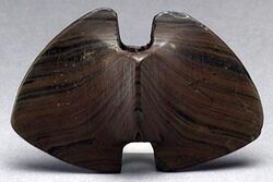 Based on previous work done by William S. Webb, William R. Perkins[8] claims that spear-thrower weights, commonly called "bannerstones", and characterized by a centered hole in a symmetrically shaped carved or ground stone, shaped wide and flat with a drilled hole and thus a little like a large wingnut, are an improvement to the design that created a silencing effect when swung. The use of the device would reduce the telltale "zip" of a swung atlatl to a more subtle "woof" sound that did not travel as far and was less likely to alert prey. Robert Berg's theory is that the bannerstone was carried by hunters as a spindle weight to produce string from natural fibers gathered while hunting, for the purpose of tying on fletching and hafting stone or bone points.[9]