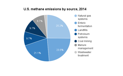 The U.S. Environmental Protection Agency (EPA) identified seven areas of human-caused methane emissions, three of which comprised over 66 percent of all U.S. methane emissions in 2014. The chart in this section shows the top seven sources of methane emissions in the U.S. that year.