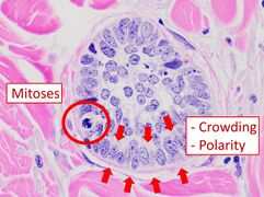 Cellular arrangement, including crowding and cell polarity (common tendencies among cells at the border, such as elongation or "palisading" in this case). Amount of mitoses can also be appreciated at this level.