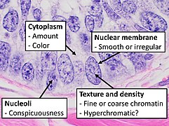Pleomorphic when having different sizes and shapes. This often correlates with an increased nucleus to cytoplasm ratio. These features generally indicate malignancy.