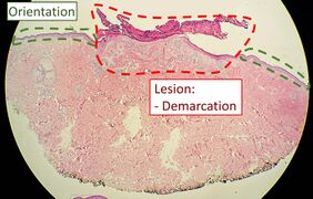 Orientation (lowest magnification): In this case oriented by the skin surface (green). A lesion is seen (red) and its demarcation can be discerned (diffuse in this case)