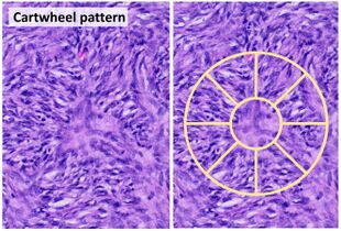 Cartwheel pattern: Center points that radiate cells or connective tissue outward