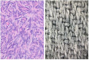 Woven or storiform: Elongated cells or nuclei wherein small bundles are aligned in an otherwise haphazard pattern.