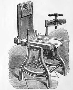 ↑R. Hoe & Company (1881). Catalogue of printing presses and printers' materials, lithographic presses, stereotyping and electrotyping machinery, binders' presses and materials. R. Hoe & Company. pp. 134. https://archive.org/details/catalogueofprint00rhoe. Retrieved 2020-08-12.