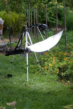 A scrim can also be a translucent gauze type material that may be fastened onto a frame, and used outdoors to reduce the intensity of, and soften harsh light on subjects/people being filmed or photographed. They are available in a multitude of shapes and sizes, either small enough to be held in one hand by a photographer or assistant, up to almost tent like contraptions.