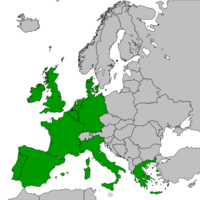 Having "resolved to achieve the strengthening and the convergence and to establish an economic and monetary union including,... a single and stable currency",[27] the Treaty ruled that "Member States shall regard their economic policies as a matter of common concern", and that the obligations assumed should be a matter for "mutual surveillance."[28] Commonly known as the Maastricht criteria,[29][30] these obligations represented the performance thresholds for member states to progress toward the third stage of European Economic and Monetary Union (EMU), the adoption the common currency (designated at the 1995 Madrid European as the Euro).[31]