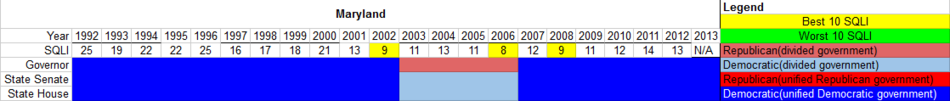 The chart below depicts the partisanship of the Maryland state government and the state's SQLI ranking for the years studied. For the SQLI, the states were ranked from 1-50, with 1 being the best and 50 the worst. Maryland experienced two long periods of Democratic trifectas, between 1992 and 2002 and again between 2007 and 2013. The state cracked the top-10 in the SQLI ranking in three separate years (2002, 2006, and 2008), twice under a Democratic trifecta and once under divided government. Maryland ranked lowest on the SQLI ranking in two separate years (1992 and 1995), in which the state placed 25th under a Democratic trifecta. Maryland has never had a Republican trifecta.