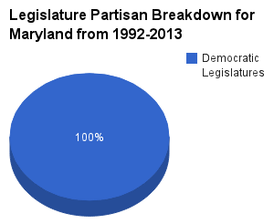 The chart below shows the partisan composition of the Office of the Governor of Maryland, the Maryland State Senate and the Maryland House of Delegates from 1992 to 2013.