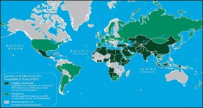 In 2017, hepatitis E was estimated to affect more than 19 million people.[7] It occurs more commonly in the developing world, particularly in Asia.[1][2] Males aged 15 to 30 are most commonly affected.[8] It may occur as an outbreak due to poor access to safe water.[2] Outbreaks of hepatitis E date back to at least 1955 in New Delhi.[9] The virus was isolated in 1983 by Russian scientists investigating an outbreak in Afghanistan.[8]