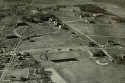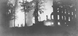 On November 29, 1912, a fire destroyed the barracks where the school housed the students, all the school's records, and most of the academic buildings, leaving only Morrill Hall untouched. There were no injuries or fatalities, and all but two students returned to the university and insisted on classes continuing.[1] Students were housed by families in neighboring towns until the school could rebuild the housing, although a new administration building was not built until the 1940s.[1] A large brick and concrete compass inlaid in the ground designates the former center of campus as it existed in 1912.