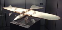 He continued his research, and in 1804 constructed a model glider which was the first modern heavier-than-air flying machine, having the layout of a conventional modern aircraft with an inclined wing towards the front and adjustable tail at the back with both tailplane and fin. The wing was just a toy paper kite, flat, and uncambered. A movable weight allowed adjustment of the model's center of gravity.[66] It was "very pretty to see" when flying down a hillside, and sensitive to small adjustments of the tail.[67]