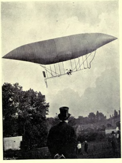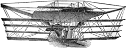 The Aerial Steamer, made by Thomas Moy, sometimes called the Moy-Shill Aerial Steamer, was an unmanned tandem wing aircraft driven by a 3 horsepower (2.2 kW) steam engine using methylated spirits as fuel. It was 14 feet (4.3 m) long and weighed about 216 pounds (98 kg) of which the engine accounted for 80 pounds (36 kg), and ran on three wheels. It was tested in June 1875 on a circular rolled gravel track of nearly 300 feet (91 m) diameter. It did not reach a speed of above 12 miles per hour (19 km/h), but a speed of around 35 miles per hour (56 km/h) would be necessary to lift off.[92] However it is credited with being the first steam-powered aircraft to have left the ground under its own power by the historian Charles Gibbs-Smith.[93][94]