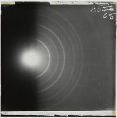 In 1927 at Bell Labs, Clinton Davisson and Lester Germer fired slow-moving electrons at a crystalline nickel target.[2][3] The diffracted electron intensity was measured, and was determined to have a similar angular dependence to diffraction patterns predicted by Bragg for x-rays. At the same time George Paget Thomson and Alexander Reid at the University of Aberdeen were independently firing electrons at thin celluloid foils and later metal films, observing rings which can be similarly interpreted.[1] (Alexander Reid, who was Thomson's graduate student, performed the first experiments but he died soon after in a motorcycle accident[30] and is rarely mentioned.) Before the acceptance of the de Broglie hypothesis, diffraction was a property that was thought to be exhibited only by waves. Therefore, the presence of any diffraction effects by matter demonstrated the wave-like nature of matter.[31] The matter wave interpretation was placed onto a solid foundation in 1928 by Hans Bethe,[32] who solved the Schrödinger equation,[20] showing how this could explain the experimental results. His approach is similar to what is used in modern electron diffraction approaches.[33][34]