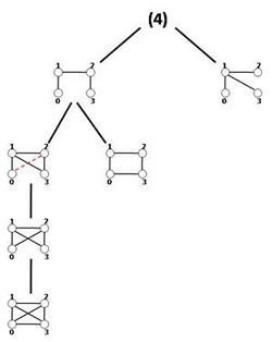 As discussed above, the algorithm starts by computing sub-tree frequencies in the network and then expands sub-trees edge by edge. One way to implement this idea is called the expansion tree Tk for each k. Figure shows the expansion tree for size-4 sub-graphs. Tk organizes the running process and provides query graphs in a hierarchical manner. Strictly speaking, the expansion tree Tk is simply a directed acyclic graph or DAG, with its root number k indicating the graph size existing in the expansion tree and each of its other nodes containing the adjacency matrix of a distinct k-size query graph. Nodes in the first level of Tk are all distinct k-size trees and by traversing Tk in depth query graphs expand with one edge at each level. A query graph in a node is a sub-graph of the query graph in a node's child with one edge difference. The longest path in Tk consists of (k2-3k+4)/2 edges and is the path from the root to the leaf node holding the complete graph. Generating expansion trees can be done by a simple routine which is explained in.[36]