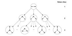 Schreiber and Schwöbbermeyer [12] proposed an algorithm named flexible pattern finder (FPF) for extracting frequent sub-graphs of an input network and implemented it in a system named Mavisto.[27] Their algorithm exploits the downward closure property which is applicable for frequency concepts F2 and F3. The downward closure property asserts that the frequency for sub-graphs decrease monotonically by increasing the size of sub-graphs; however, this property does not hold necessarily for frequency concept F1. FPF is based on a pattern tree (see figure) consisting of nodes that represents different graphs (or patterns), where the parent of each node is a sub-graph of its children nodes; in other words, the corresponding graph of each pattern tree's node is expanded by adding a new edge to the graph of its parent node.